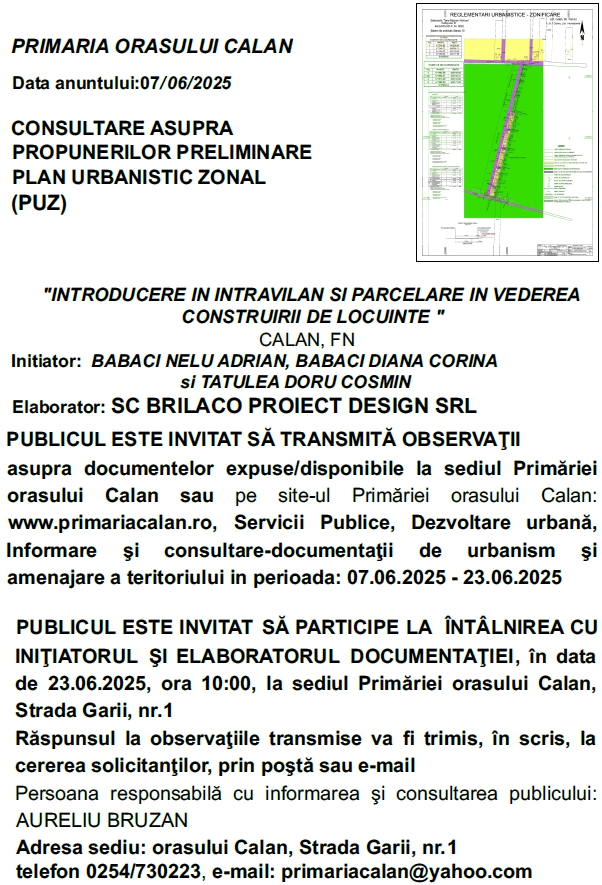 CONSULTARE ASUPRA PROPUNERILOR PRELIMINARE – PLAN URBANISTIC ZONAL (PUZ)
