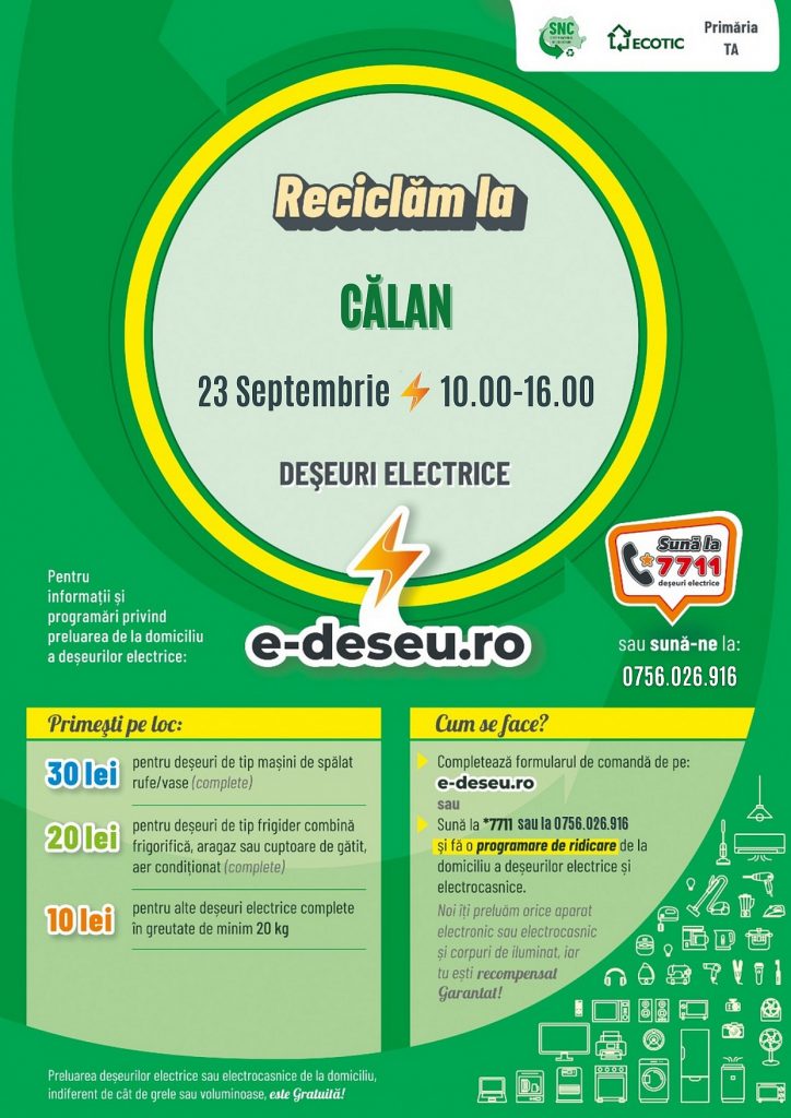 Se colectează deșeuri DEEE (DEȘEURI DE ECHIPAMENTE ELECTRICE ȘI ELECTRONICE) între orele 10.00 – 16.00 în UAT CĂLAN. Acțiunea este realizată de S.C. Sistem Local de Colectare – Centru S.R.L. punct de lucru Hunedoara, cu sprijinul Primăriei Călan. Ridicarea echipamentelor se face de la domiciliu. Pentru programări sunați la 0756026916.