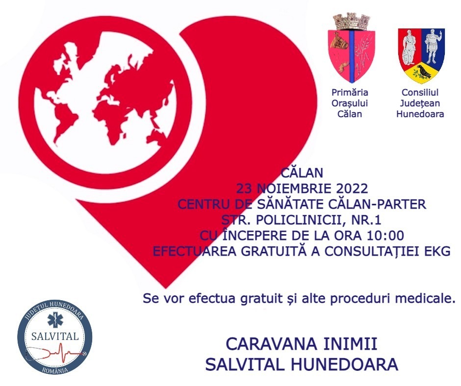 23 noiembrie 2022 – CĂLAN – CARAVANA INIMII – SALVITAL – Centrul de Sănătate (Policlinica) CĂLAN – PARTER – cu începere de la ora 10.00